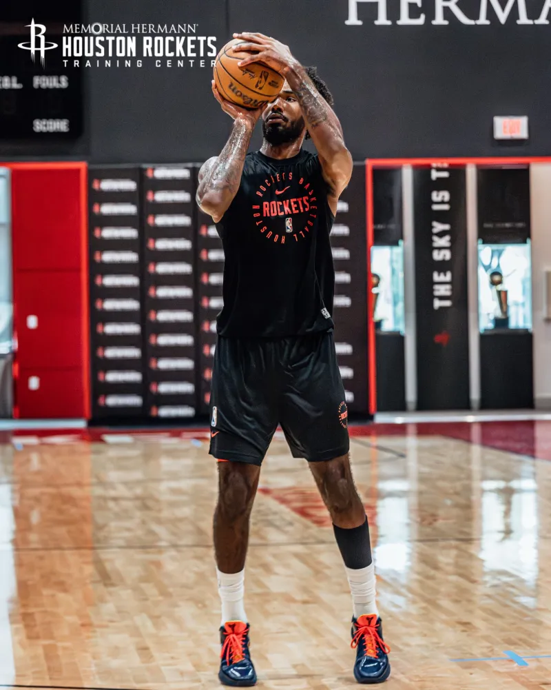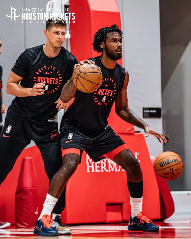 防守大闸!火箭社媒晒伊森现身火箭训练馆的训练组图